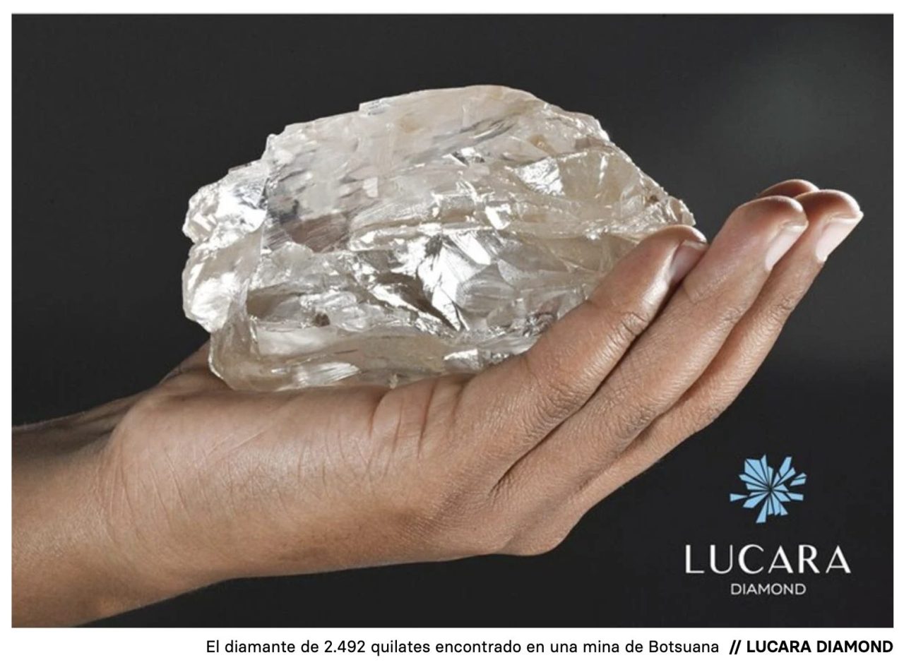 Un diamante de tamaño excepcional, de 2.492 quilates y que apenas cabe en la palma de la mano, ha sido hallado en la mina de Karowe en Botsuana por la empresa canadiense Lucara Diamond Corp.