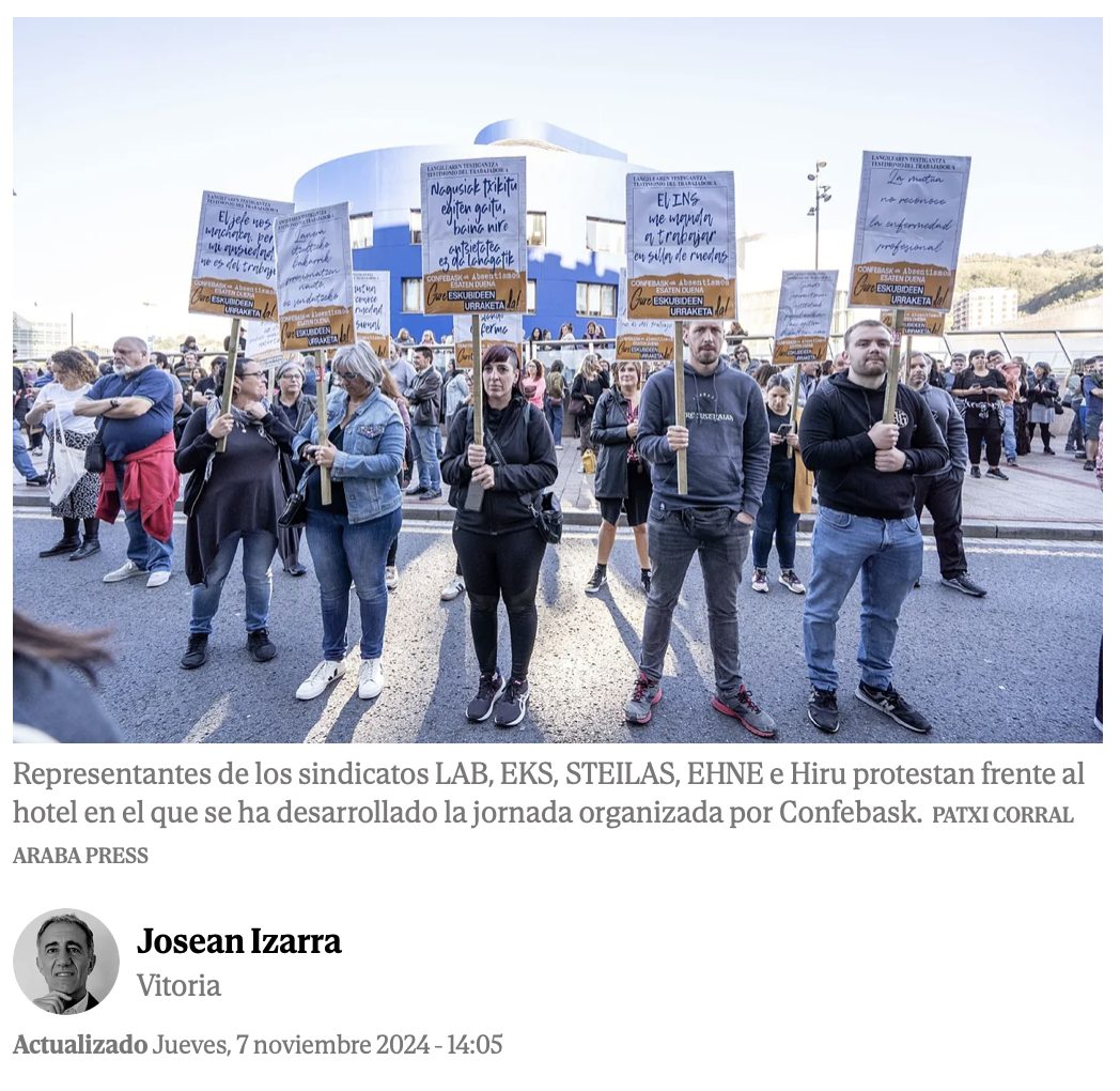 Euskadi lidera el absentismo laboral en Europa con una media de 57.826 (5,8%) de su población ocupada de baja. Un informe elaborado por la Fundación Orkestra encargado por Confebask ratifica los datos que periódicamente hacen público las agencias privadas de empleo. El alto absentismo consolidado en Euskadi contrasta con el de Madrid (3,2%) o el de Cataluña (3,9%) y preocupa a las empresas vascas. La presidenta de Confebask Tamara Yagüe ha planteado hoy la necesidad de un «pacto» para revertir esta situación porque el absentismo constituye un «desafío para la productividad y la competitividad» de las empresas. | @elmundo