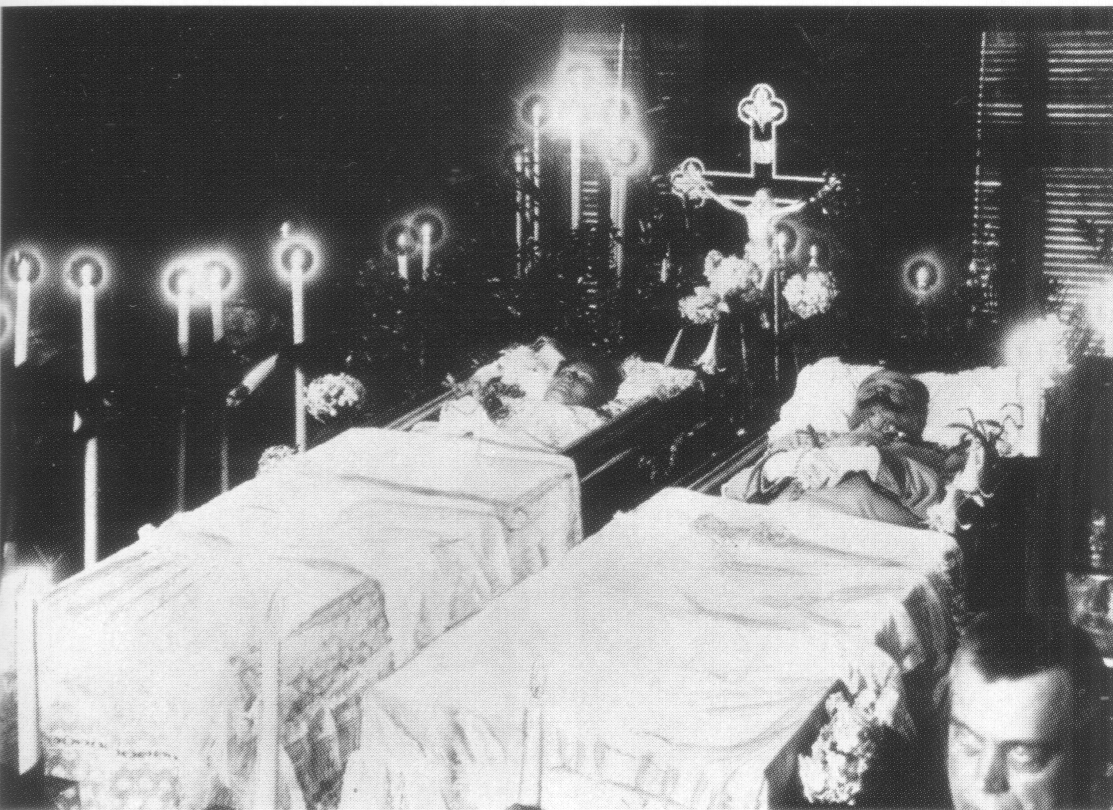 Los cuerpos embalsamados del archiduque Francisco Fernando y la duquesa Sofía en sus ataúdes, junio de 1914.