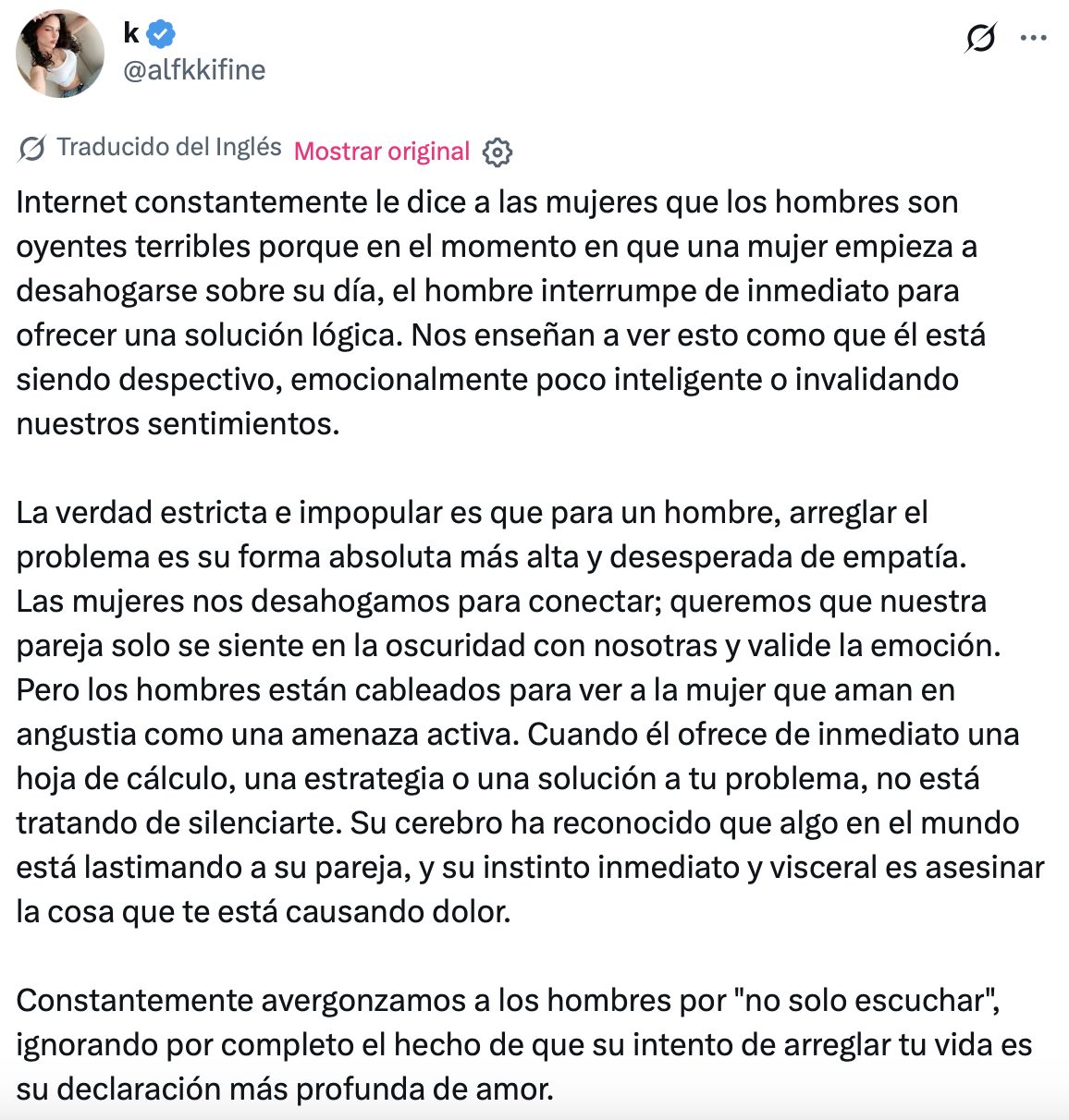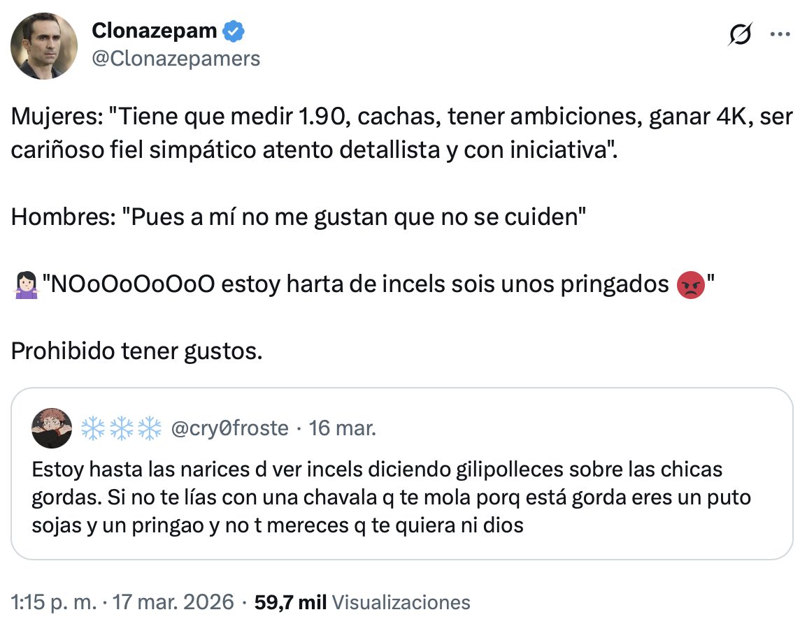 Para Pescador, es una cuestión de competitividad exacerbada. “Los hombres que consumen este tipo de masculinización tradicional tienden a competir entre ellos: ser los que más peso levantan, los que más músculo desarrollan, los que más ligan”, continúa para señalar una anécdota personal reciente. “Hace unos días, estaba en el gimnasio y un varón que rondaría los 60 años estaba levantando un peso excesivo. Se quedó a la mitad, claro, y toda su conversación posterior se centró en justificarse: que es que no era la hora buena para entrenar porque él siempre levanta el doble”, cuenta Pescador para poner el foco en las consecuencias de toda esta presión: “Nunca vas a poder llegar a ese ideal, nunca vas a alcanzar todo lo que se te propone socialmente, siempre va a haber algo más allá, algo que no consigas, y eso tiene un gran impacto a nivel mental”, asegura.