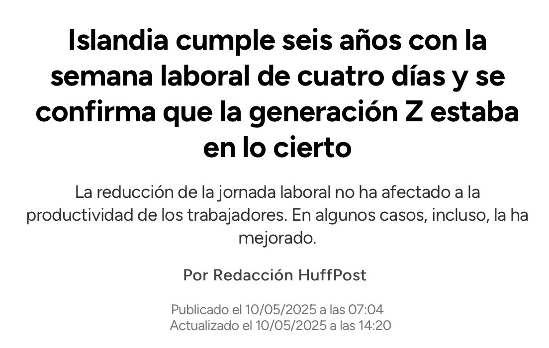 Los temores iniciales, similares a los observados en otros países como Alemania, se centraron principalmente en un posible colapso de la productividad o la complejidad de la compensación salarial. Sin embargo, la experiencia islandesa ha disipado estos temores. Los informes, incluidos los analizados por think tanks tan solventes como Autonomy, indican que la productividad no sólo se ha mantenido, sino que en ocasiones incluso ha mejorado. | @huffingtonpost