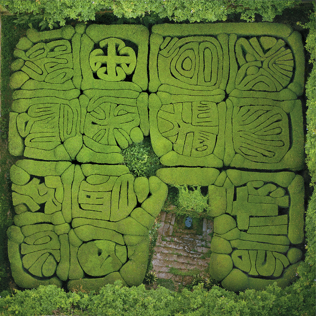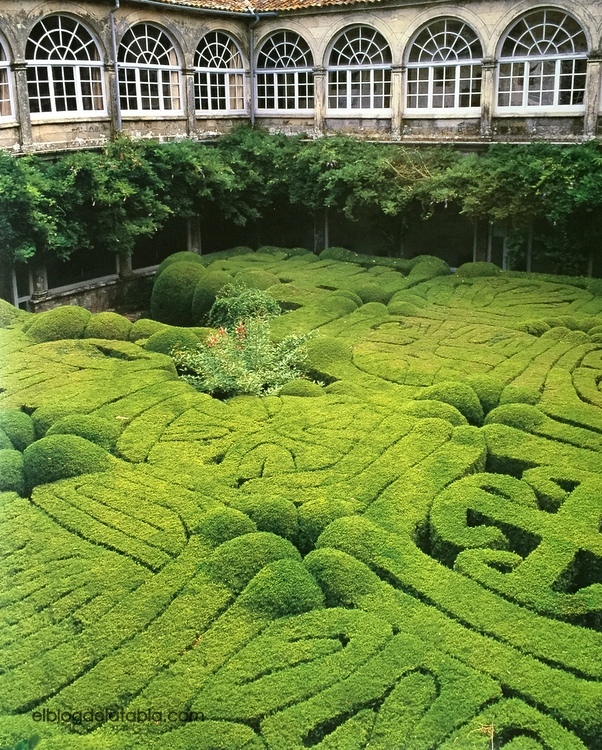 Se trata de un jardín laberíntico de boj, tallado con complicadas formas hace ya cuatro siglos. Al contrario de lo que sucede en las arquitecturas vegetales clásicas, los secretos escondidos del laberinto de Santiago no se desnudan adentrándose en su interior, sino desde el cielo.