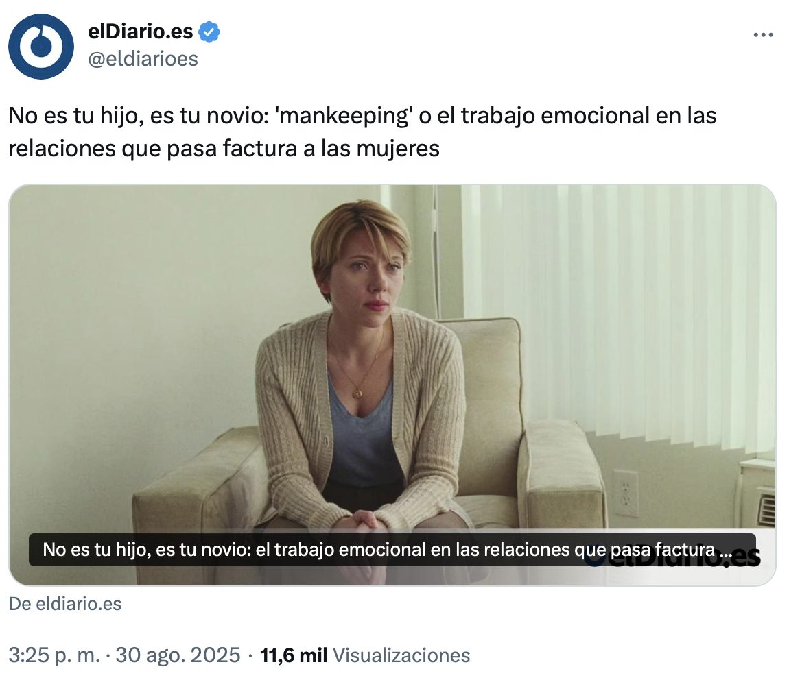 En esencia, el mankeeping es cualquier trabajo emocional que las mujeres realizan para reforzar el apoyo social de su pareja o de sus amigos, sin reciprocidad. Podría ser recordarles a los hombres de tu vida que llamen a su amigo u organizar un viaje de amigos. Animarlos a hablar sobre su día estresante en el trabajo y luego contactarlos regularmente, en lugar de hablar de tu propio día difícil. Convertirse en confidente y dar consejos sin recibir nada a cambio.