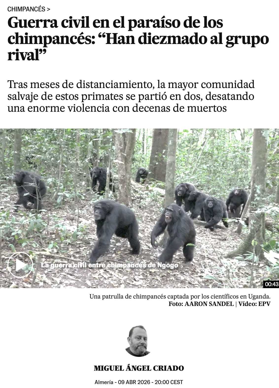 El 24 de junio de 2015 algo cambió en el parque nacional de Kibali (Uganda), hogar de los Ngogo, la mayor comunidad de chimpancés de África. “Fue cuando vimos el primer caso de individuos de diferentes vecindarios del grupo tratándose como extraños”, cuenta Aaron Sandel, primatólogo de la Universidad de Texas en Austin (Estados Unidos) y primer autor de un estudio publicado en Science que muestra cómo desde dentro de un colectivo que lleva años de convivencia pacífica puede surgir primero la polarización, después la división y, finalmente, la violencia y la guerra. Desde aquel verano, la comunidad de Ngogo se ha partido en dos y los ataques letales, también a las crías, han acabado con decenas de muertos. | @elpais