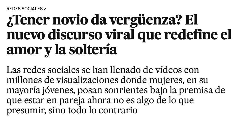 Todo ha sucedido después de que la periodista Chanté Joseph publicase a finales de octubre en la edición británica de la revista Vogue el artículo titulado Is Having a Boyfriend Embarrassing Now? Este texto plantea la idea de que ahora “estar en pareja ya no afirma tu feminidad” y que “pronunciarse soltera se ha convertido en un gesto de orgullo”. El impacto social que ha generado es tal que algunas de las publicaciones comentando este escenario en internet tienen millones de visualizaciones y se acompañan de miles de comentarios de apoyo. Pero, ¿de verdad tener novio se ha convertido en algo “vergonzoso”? ¿Estamos ante un cambio real en la manera en que entendemos el amor y las relaciones, o solo frente a otra moda pasajera virtual? ¿Qué hay detrás de esta reivindicación de la soltería? ¿Empoderamiento, hartazgo o simple postureo digital?