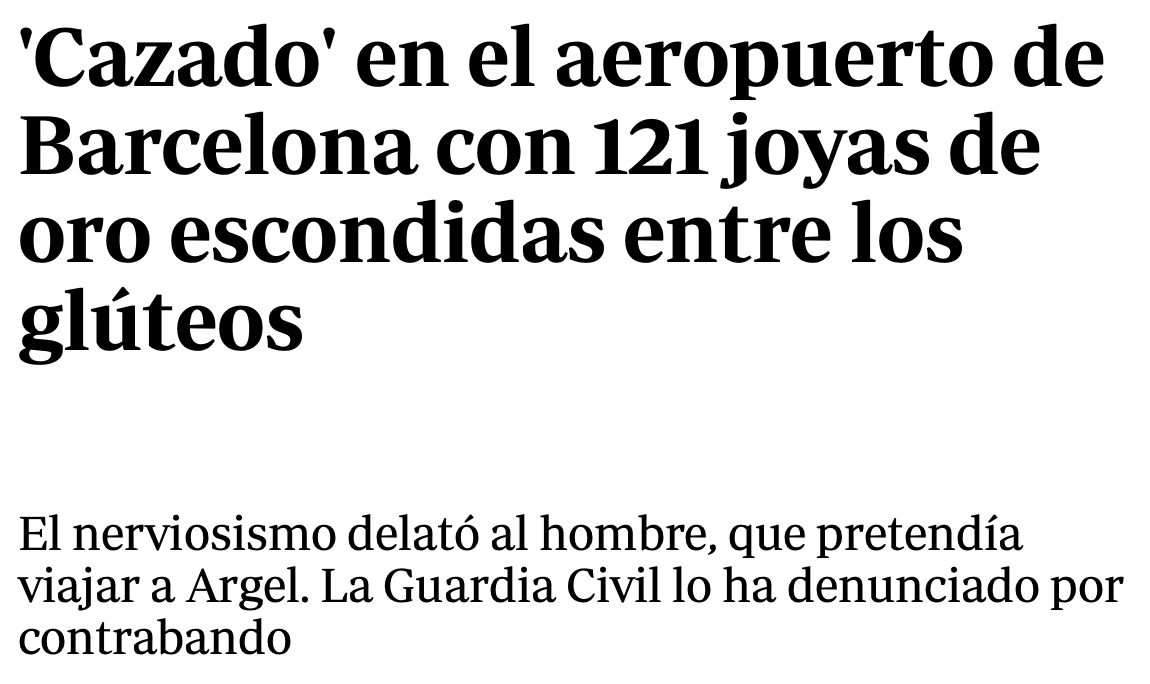 Qlito de oro Ahora la investigación se centra ahora en determinar el origen del oro, por si pudiera haber sido robado. Por el momento, ha quedado a disposición del administrador de la Aduana del aeropuerto de Barcelona. | @abc noticiasoro No hay comentarios random 24 octubre, 2024