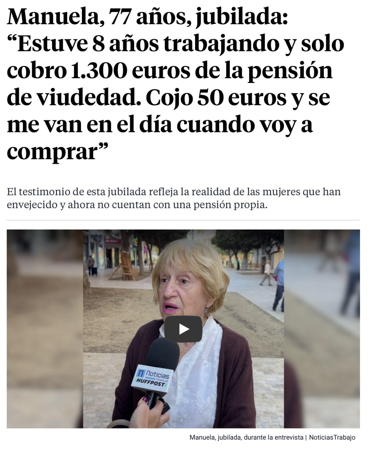 Es el caso de Manuela Rueda, que a sus 77 años asegura, en una entrevista para NoticiasTrabajo, estar jubilada gracias exclusivamente a la pensión de viudedad que dejó su marido, militar de profesión, después de una vida laboral marcada por trabajos esporádicos e intermitentes que no le permitieron generar una pensión contributiva propia.