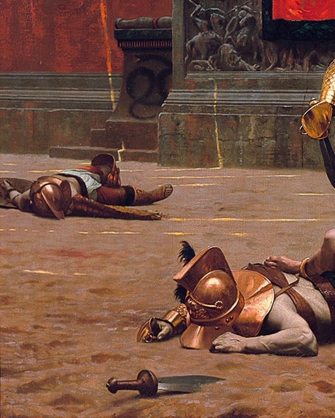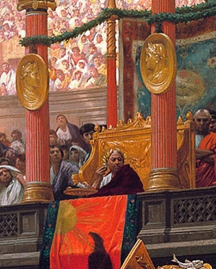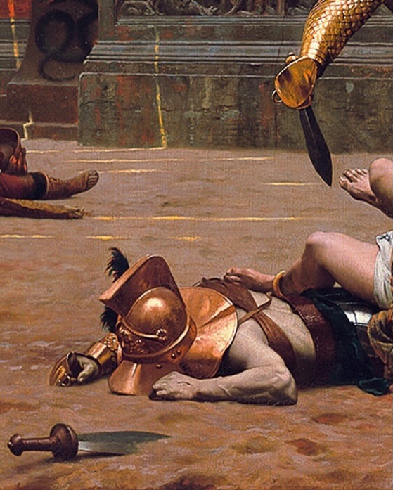 Junto a gladiadores, vestales y espectadores, la imagen muestra al emperador en su palco, esperando a ver quien tiene la mayoría para dar el veredicto definitivo.