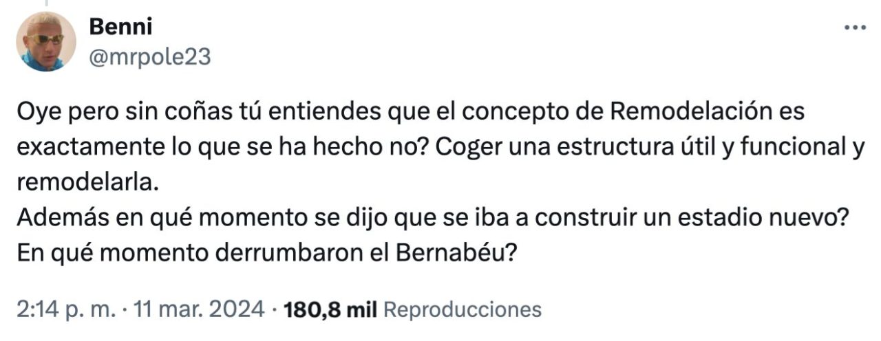 Por otro lado, desde el bando antimadridista hay quienes han tildado el nuevo aspecto del estadio de «lata de sardinas» o cosas peores. Un hate que se ha visto incrementado con una imagen que está recorriendo las redes sociales en las que se ve la parte interior del Bernabéu.