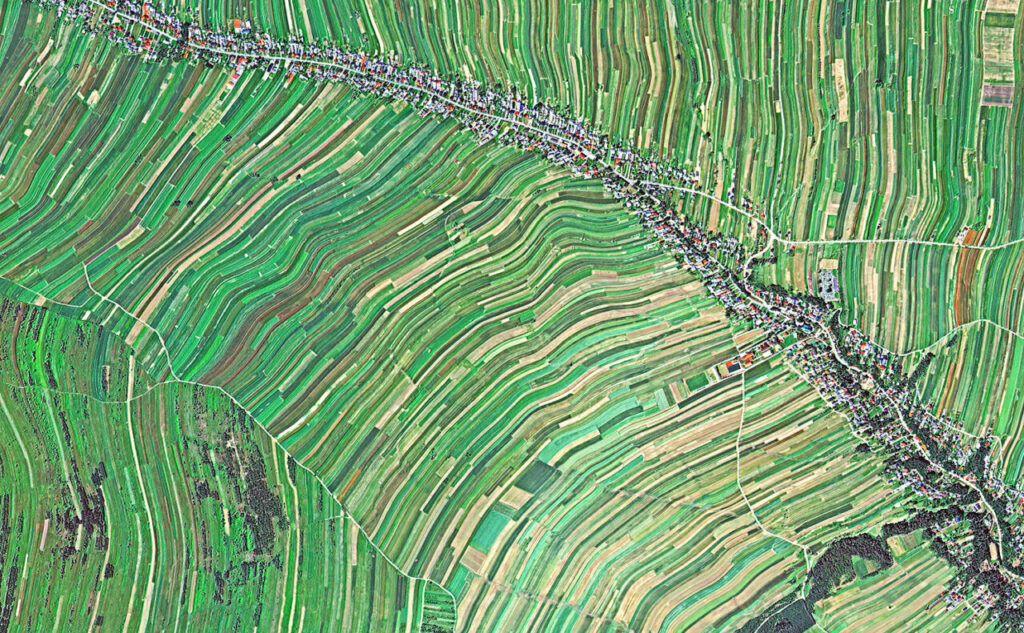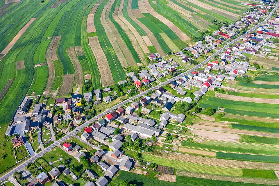 Esta disposición urbana casi no se puede ver en ningún otro lugar del mundo, salvo en esta área de Polonia, donde varios pueblos toman esta forma de diagramar su tejido urbano.