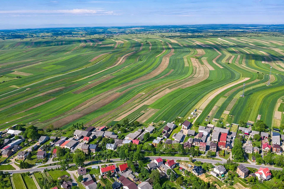 Para hacer aún más peculiar la composición del pueblo, sus campos de cultivo parten en forma perpendicular de la única calle de Suloszowa dibujando un paisaje Particular.