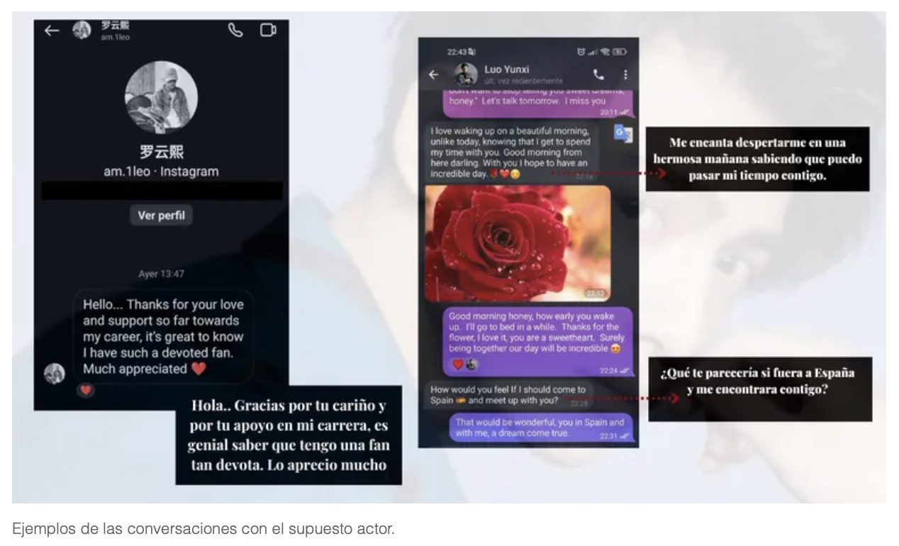 Un mes después de comenzar a seguir esa cuenta oficial y de interaccionar con algunas publicaciones, María recibe un primer mensaje privado, supuestamente, desde esa misma cuenta oficial. «La misma foto de perfil, los mismos seguidores, el mismo nombre. Todo era tal cual», explica. «Hola, muchas gracias por tu apoyo en mi carrera, es genial saber que tengo una fan tan devota. Lo aprecio mucho (emoji de corazón)», decía en inglés en esas primeras líneas de contacto. Es verdad que María se sorprendió, pero ella desconocía que en China fuera tan famoso y realmente creyó que podría ser una campaña de fidelización de fans extranjeros. «Es más, él mismo lo justificó todo incluso antes de preguntarle. Me explicó que de vez en cuando revisan los nuevos seguidores para prestarles un poco más de atención. Además, me dice abiertamente que han estado notando que en algunos países les habían hackeado algunas cuentas haciéndose pasar por él y que por eso intentaba tener un trato más cercano», recuerda María. «Simplemente comenzamos a hablar, cada vez más a menudo. Un poco de nuestros gustos, de cómo es mi país. Una conversación fluida, como de amigos», explica.