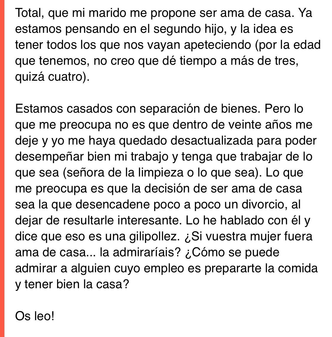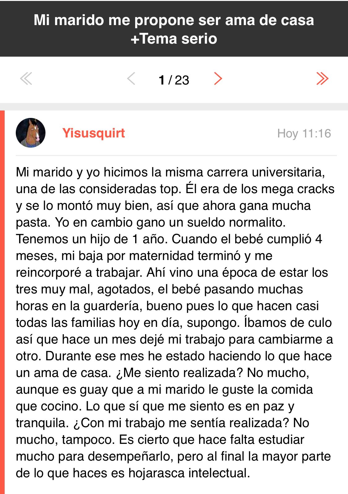 Yo veo bastante negativo ser ama de casa. Mientras los niños son muy pequeños pedir la baja por maternidad sí. Pero los niños crecen muy rápido y ser ama de casa se convierte en una tortura china. Hoy en día, tener la casa ordenada no cuesta nada. Yo al menos, tengo un setup de la ostia con lavavajillas, lavadora, secadora, aspiradores, airfryer, etc. Literalmente en 1 hora puedo tener la casa bastante limpia y en 1 día puedo hacer una limpieza general y dejarlo todo perfecto. Si eres ama de casa full time, debe de ser algo muuuuuuuy aburrido. Por otro lado, no me siento mal ganando menos dinero que mi pareja, ya que considero que tengo un estilo de vida tranquilico xd. Para mis cosas me da de sobra lo que gano yo. También gano menos € pero las cosas de casa las hago yo todas al 100%, Josu no tiene que hacer absolutamente nada. Pero si mi pareja me tiene que pagar hasta mis bragas y tampones pues me sentiría mal. Cada uno que haga como más cómodos se sientan, pero en mi caso es así.
