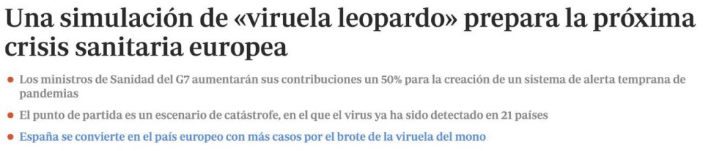 Mientras seguimos luchando contra las consecuencias de la pandemia de coronavirus, los ministros de Sanidad del G7 ya se están preparando para la próxima crisis sanitaria. Durante la reunión mantenida ayer en Berlín, trabajaron con una simulación que perfilaba el curso y desarrollo de una pandemia de viruela en 2023, una representación protagonizada por la ficticia «viruela del leopardo», con el fin de que una hipotética próxima pandemia no nos tome tan inesperadamente y sin preparación como sucedió en 2020. El ensayo permitió hacer previsiones de las necesidades de «seguimiento, respuesta y preparación», gracias a un caso simulado en el que el origen de la enfermedad ficticia no es un murciélago de Wuhan, China, sino la mordedura de un leopardo que transmite la viruela y se propaga persona a persona muy rápidamente por todo el mundo.