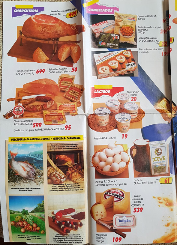 Comenzamos en la charcutería y comprobamos cómo se podía comprar un jamón serrano por piezas a 3€ el kilo, calculemos que uno de unos 7 kilos se quedaría en 21€. Busque, compare y si lo encuentra en la actualidad cómprelo. Más sorprendente es el precio de los yogures, 19 pesetas el natural y 20 pesetas el de sabores, unos 0,12€.