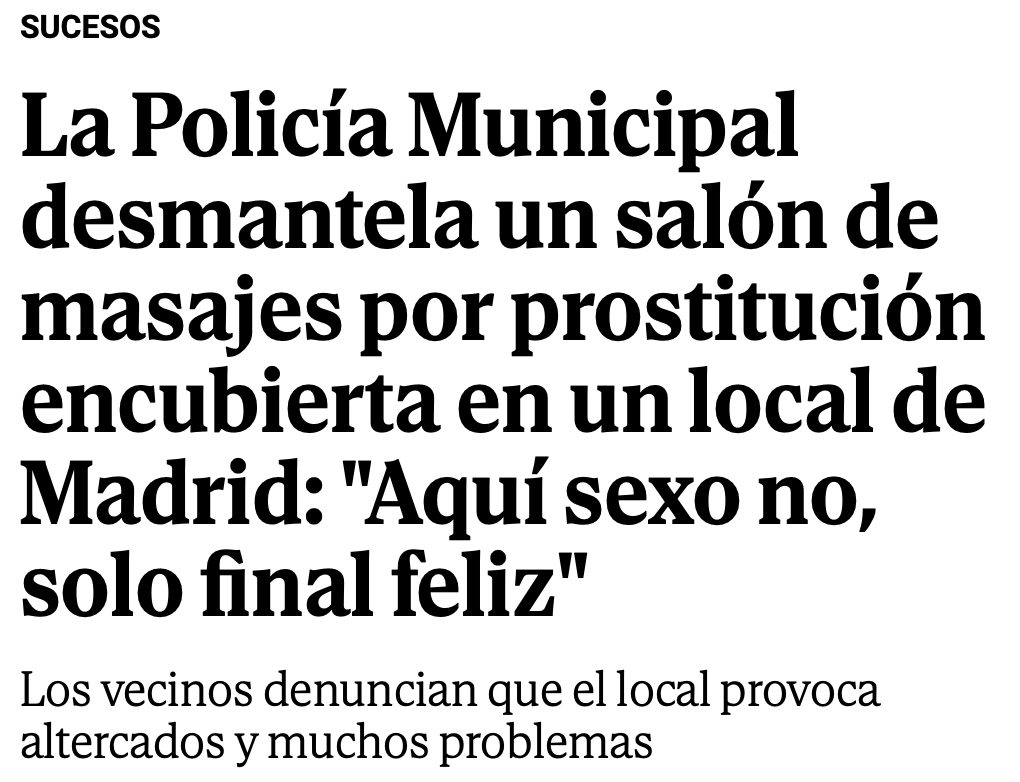 Alguno de los vecinos aseguran que llevan tiempo denunciando la existencia de este local como un sitio de prostitución encubierta de mujeres asiáticas. Aseguran que le pidieron explicaciones a la mujer que lleva el negocio y que les respondió entre risas: «Aquí sexo no, solo masaje con final feliz».